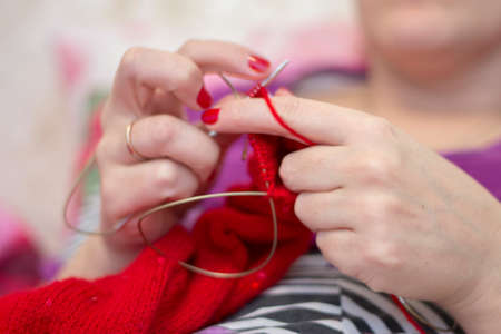Adult woman knits with knitting needles a red sweater from natural woolen threads indoor