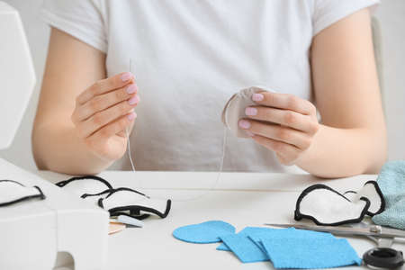 Woman with needle making reusable cotton pad at table, closeup
