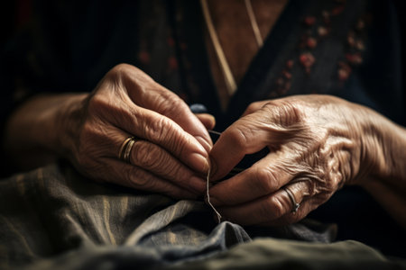 Close-up view of elderly hands gently preparing thread for sewing on a blue fabric. This imagery captures the passion for traditional craftsmanship and manual skills.