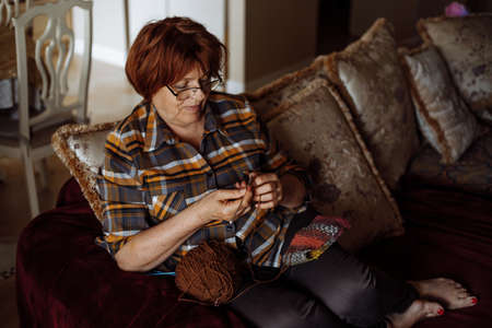 Mature red haired woman in glasses sitting on sofa in living room and knitting using needles and ball of thread. Pensioner home leisure and handmade crafting hobby. Retirement lifestyle