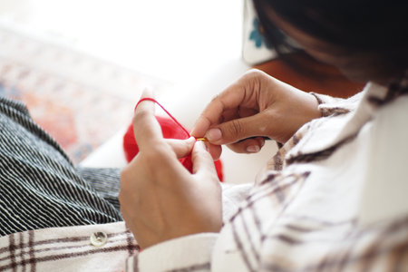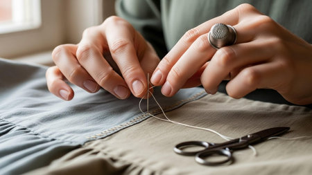 Hand sewing a button on a garment at home during daylight hours