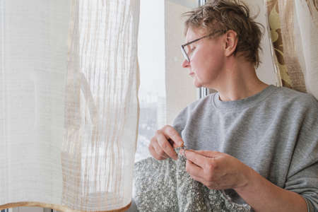 Middle-aged woman is knitting a gray wool scarf sitting by the window. The woman is doing needlework.
