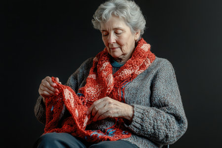 An elderly woman skillfully knits a vibrant scarf, focusing intently on her craft in a calm setting.