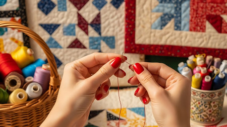 Hands holding a thread and needle in front of quilts and sewing supplies.