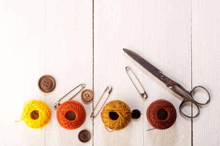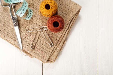 Sewing accessories on the tailor flat lay table background.