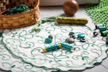Silk green thread in needle, on work table. With spools of thread, buttons, embroidery fabrics, basket. Horizontal.