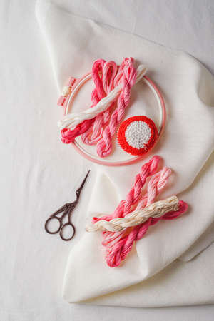 Set for embroidery. Linen fabric, patterns for embroidery, hoops, threads of pink colors and needles. Copy space, top view