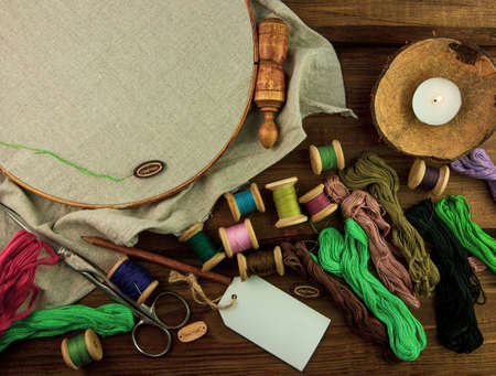 Embroidery needlework background Linen in hoop mockup. Colorful floss thread scissors card tag. Handmade ethnic style clothes making home decor tablecloth. New normal lockdown hobby crafts tutorial.