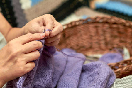 Close-up of women's hands knitting woolen clothes on the table