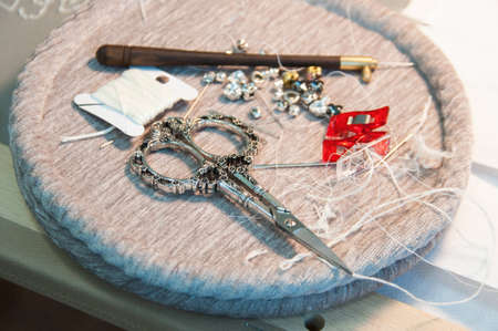 Hand embroidery with needle, thimble and scissors