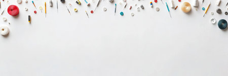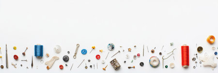 Panoramic view on sewing composition with threads on white background. Long banner, top view, copy space, flat lay, mock up