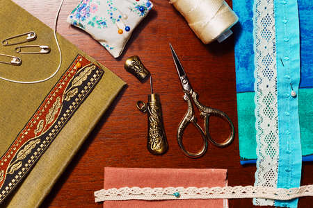 Retro sewing items: tailoring scissors, cutting knife, thimble, wooden thread spools, cushion for including pins, fabrics and sewing accessories.