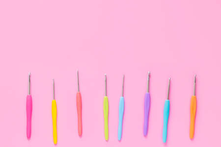 Various size bright crochet hooks on pink background
