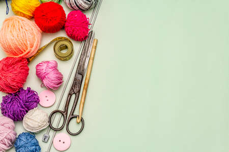 Various wool yarn and knitting needles, creative knitting hobby in pastel colors on paper with copy-space