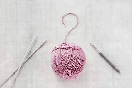 To knit or to crochet - that is the question. Ball of yarn, crochet hook and knitting needles spokes