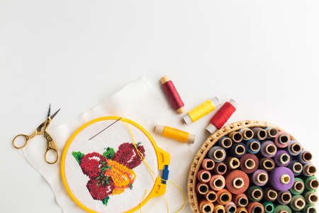 Creativity and needlework sewing and embroidery flat lay copy space