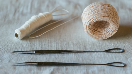 This image showcases essential sewing tools, including sharp needles, delicate thread, and natural twine, arranged beautifully on a textured fabric, ideal for craft enthusiasts.