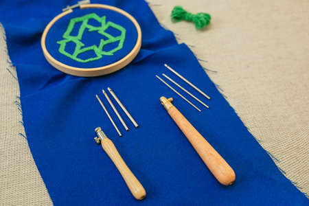 A set of two punch needles diassembled and embroidered project in a hoop on blue fabric blurred on the background. Concept of punch needles as craft instruments.