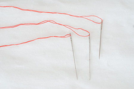 Row of sewing embroidery needles with red thread and shadows cast on background