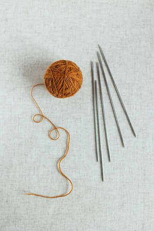Cozy ball of yarn and needles for knitting. Background for handmade and slow homelife. Place for text.