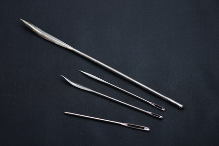 antique leather needles on a wooden table ready for a saddler's use or a very nice hobby