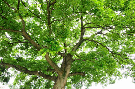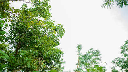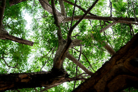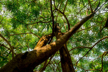A view underneath the tropical rainforest tree in the park, Nature background.