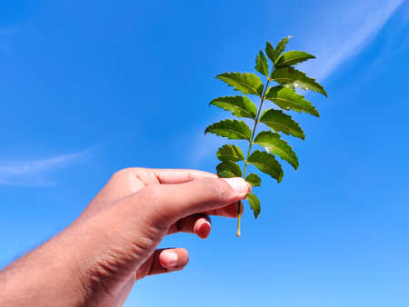 South Indian male hands holding fresh neem leaves. Cloud background