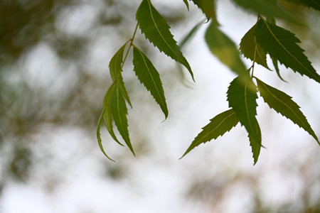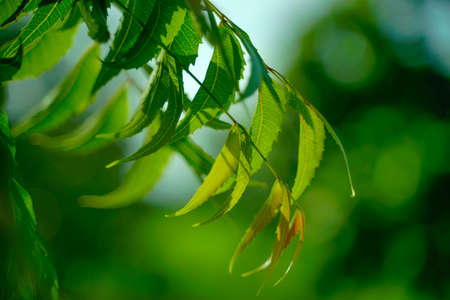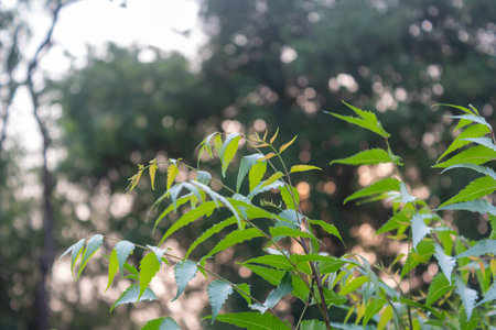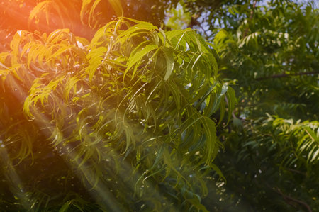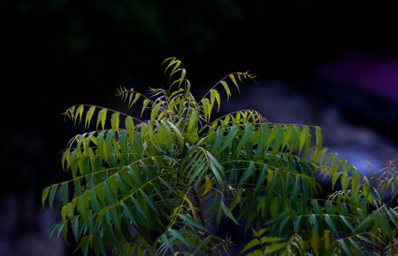 Medicinal Neem leaves, Azadirachta indica leafs on a sunny summer day during sunset, Selective focus of neem leaf.