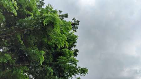 A lush, green tree with feathery leaves fills the left side of the image, contrasting against a cloudy gray sky. The image evokes a sense of calm and tranquility.
