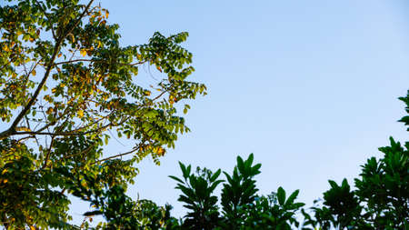 Branch trees against blue sky, bottom view. Natural green leave tree background with copy space with low angle view. Scene of fresh foliage and room for copy text, environment ecology concept