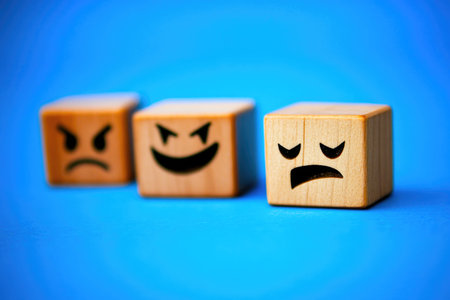 Colorful Wooden Cubes Displaying Emotions on Soft Blue Background