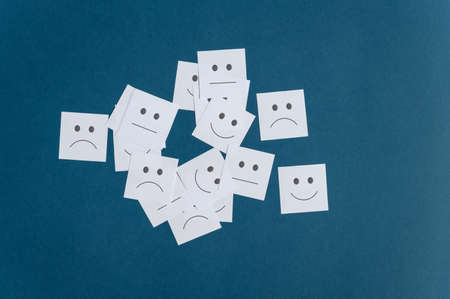Many white note papers with smiling sad and neutral faces on them. Over blue background.