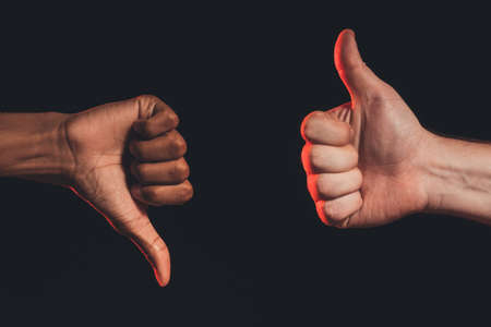 Like dislike gesture. Ethnic diversity. Closeup african male hand thumb down caucasian thumb up isolated on dark. Racial disagreement