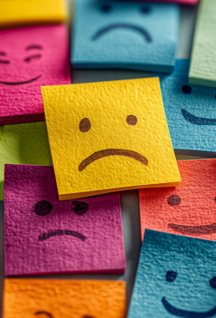 A lively assortment of vibrant sticky notes showcases a variety of facial expressions, capturing an array of feelings and states of mind on a textured surface.