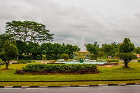 A small fountain in a Park with trees trimmed in the shape of cats. Kuching, Borneo, Sarawak, Malaysia