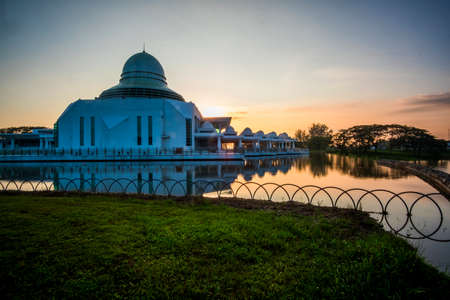 Magical sunrise at floating mosque, Masjid As Salam, Puchong with reflection on the water lake. Soft focus due to long exposure.