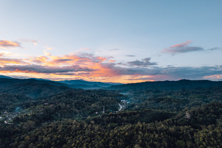 Golden sunrise aerial view in Malaysia.