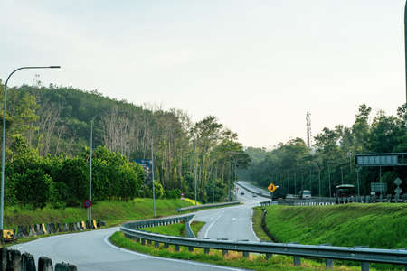 View landscape with thai people and foreign travelers driving car journey on Phet Kasem street road highway in mountain forest jungle go to travel visit Ranong southern province of Thailand
