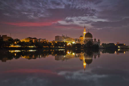 Beautiful Masjid At-Taqwa mosque with its Golden dome at the pond. Miri city, Borneo, Sarawak, Malaysia