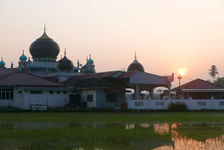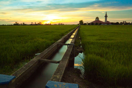 Sunrise of a mosque surrounding by paddy field in small village at Kedah,Malaysia.