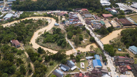 HULU LANGAT, MALAYSIA - DEC 22, 2021: Flood situation at Hulu Langat district that causes damage of the infrastructure and housing area. Selective focus, contains dust and grain