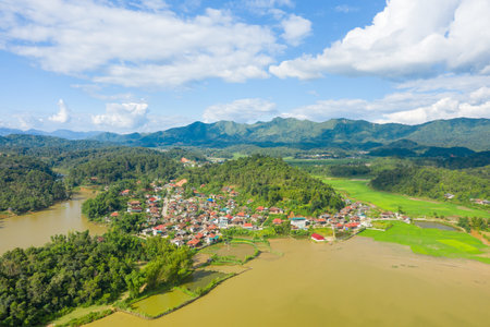 Wide aerial shot of a village nestled between a muddy lake and vibrant green rice fields, surrounded by rolling forested hills and distant mountain ranges under a bright blue sky with scattered clouds.