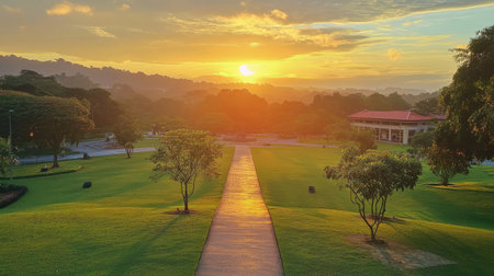 A stunning vibrant sunset over the park at UiTM Puncak. The scene features a well-maintained pathway lined with lush green grass and trees, creating a tranquil atmosphere.