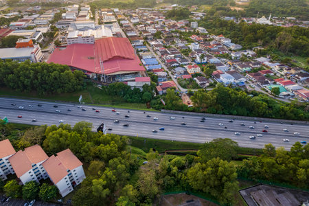 Aerial view asphalt road and rural Malays Kampung house at Balik Pulau, Penang