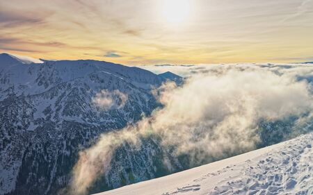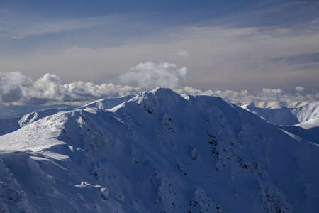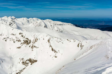 View from Kasprowy Wierch at mountain peak at winter. Amazing mountain range with snow capped mountain peaks in Tatra Mountains, Poland