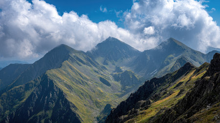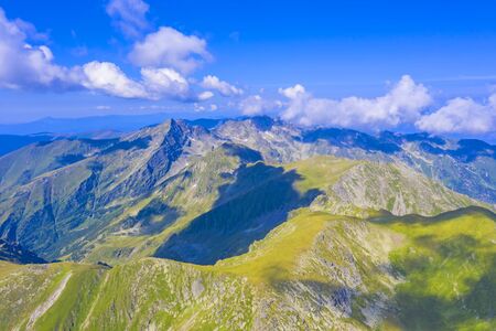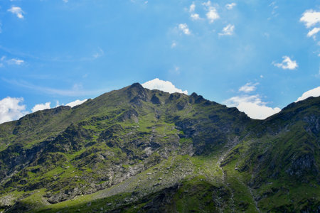 wonderful summer mountain scenery. fagaras range of romania. sunny morning. rocky cliffs and clouds. beautiful green countryside