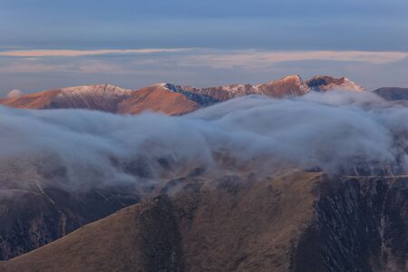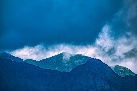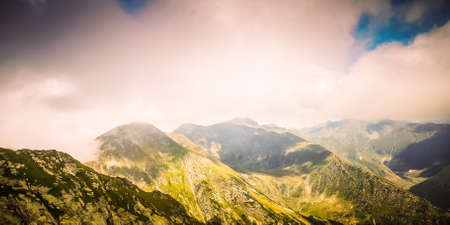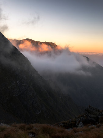 Mountains with fog and clouds at sunrise, High Mountains of Fagaras,Romania.