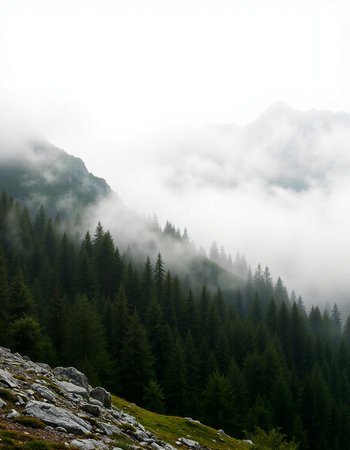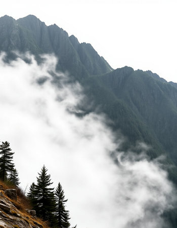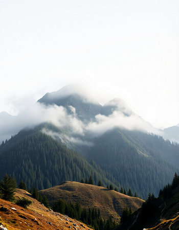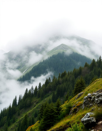 Discover a breathtaking mountain landscape enveloped in mist and low-hanging clouds, showcasing the serene beauty of nature's rugged terrain and remote valleys.