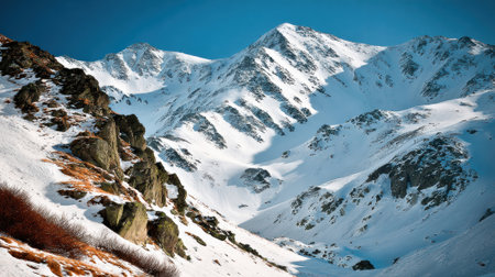 A breathtaking view of rugged mountain peaks covered in snow under a clear blue sky