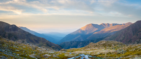 Panorama shot of golden hour in Spanish Pyrenees, National Parc Aiguestortes, on Carros de Foc hiking trail. Beauty in nature.